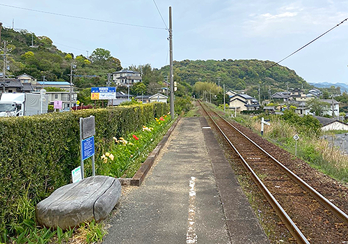 「寸座駅」は、高台に位置する小さな無人駅。駅舎もなく、ホームに待合室があるのみ。それだけに地元のみなさんの愛着がつよう駅です。