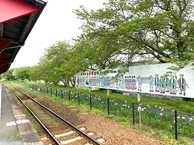 植栽エリアは、ちょうどホームに立った時、線路の向こう側に見える位置にあり、ホーム以上に長いスペースを選びました。「ソメイヨシノ」を中心に、その間を「エゴポディウム」と「スイセン」のふたつの白い花が咲くように植えていきました。