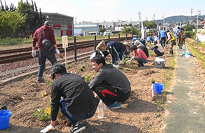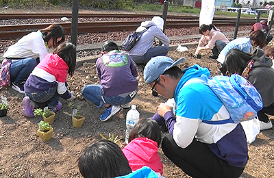金指駅では、13の企業・団体がアダプト・メンバーとして参加、「ユキヤナギ」「テマリシモツケ」「バーベナボナリエンシス」を植えました。