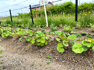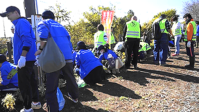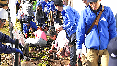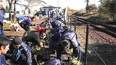 岩水寺駅では、地元赤佐8区自治会のみなさんをはじめ、多くの企業・団体が参加して「ヒナハチジョウ」「ノリウツギ」「ツワブキ」「ユーパトリウム・ピンクフロスト」を植えました。